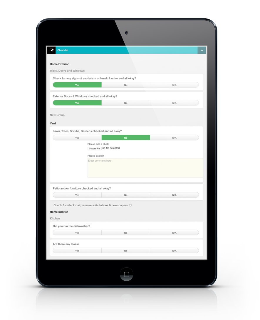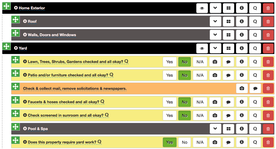 Create customized checklists in minutes for each property using our intuitive Checklist Builder. Add site-specific questions and instructions. You can even make either a Yes or No answer to a question trigger a photo request and comment box for further documentation. Drag and drop functionality allows you to place your questions in the order that you walk the property.
